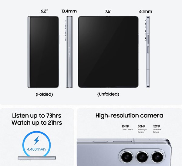 Equipped with a powerful triple rear camera setup, the Galaxy Z Fold 5 captures high-quality photos and videos with excellent detail. The advanced camera system supports ultra-wide shots, optical zoom, and enhanced night photography for clear results in low-light conditions.